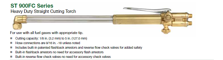 Genuine Victor ST900FC, length 21 inches, is a heavy duty straight cutting torch with top, rear-mounted cutting oxygen valve lever. It designed for use in scrap yards, demolition and foundry work. The ST900FC has a forged brass head with stainless steel gas tubes and comes complete with built-in reverse flow check valves and flashback arrestors. It can cut up to 5 inch thick steel using Victor “1” series cutting tips.